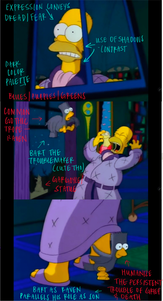 - Utilizes family dynamics (Bart the son as the mischievous Raven) within gothic tropes — including use of intense shadows, the lost love, the use of the raven symbol.