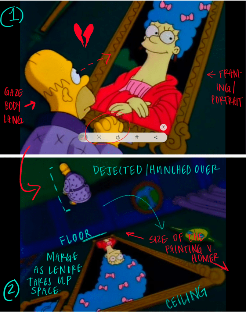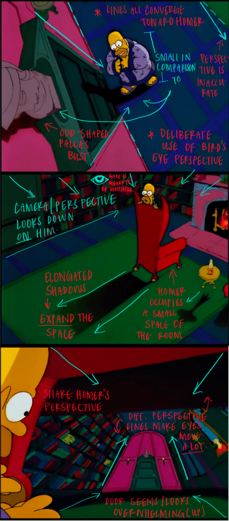 - Increased size difference between the room and Homer –> scale forces Homer to shrink amidst his growing isolation, making him appear ‘trapped.’