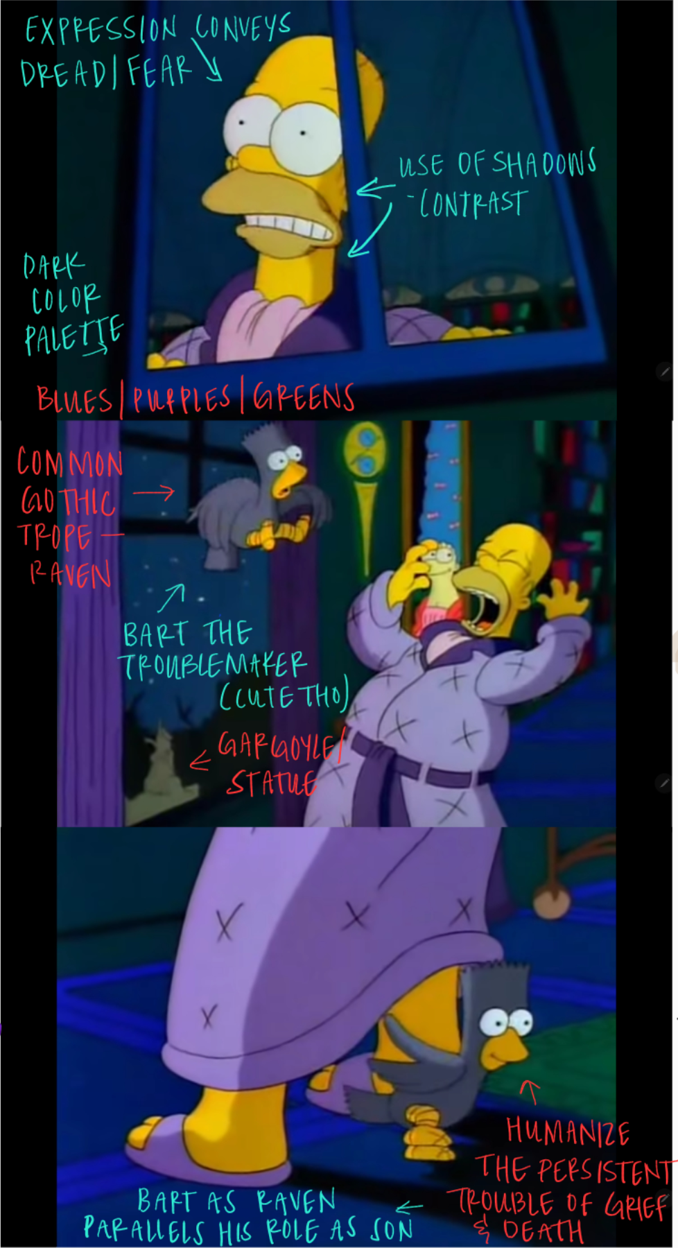 - Utilizes family dynamics (Bart the son as the mischievous Raven) within gothic tropes — including use of intense shadows, the lost love, the use of the raven symbol.