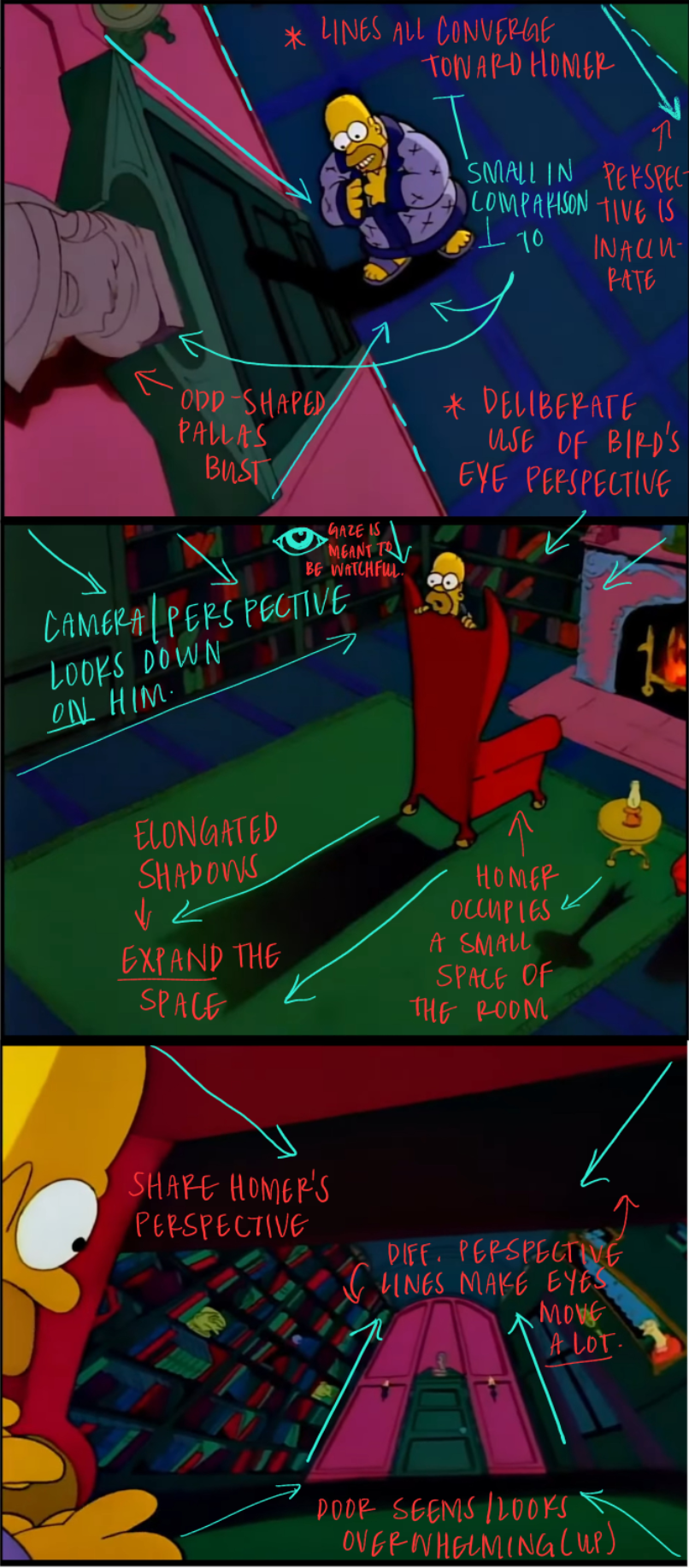 - Increased size difference between the room and Homer –> scale forces Homer to shrink amidst his growing isolation, making him appear ‘trapped.’