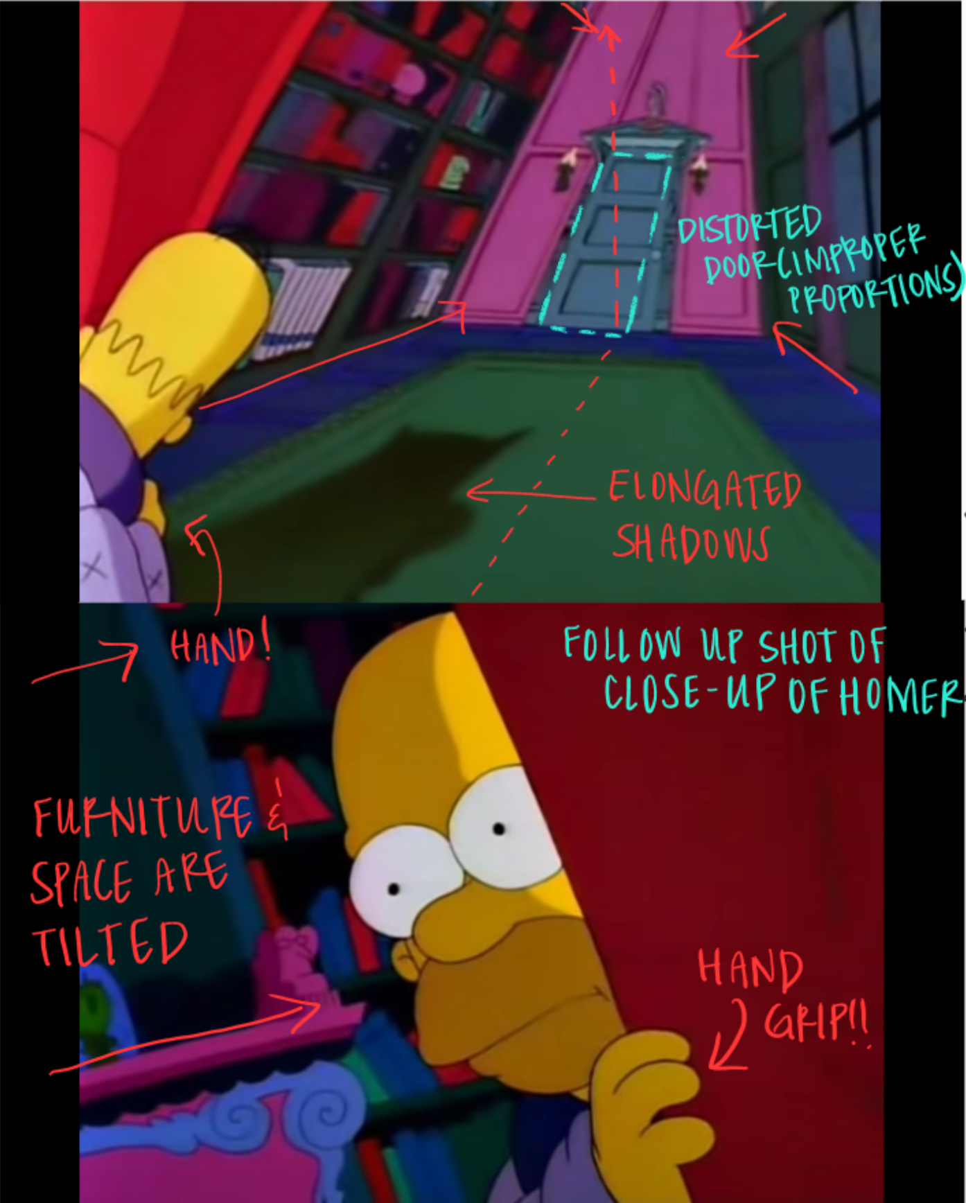 - The Dutch angle combined with quick shots between the study and Homer’s close-up externalize his growing paranoia.