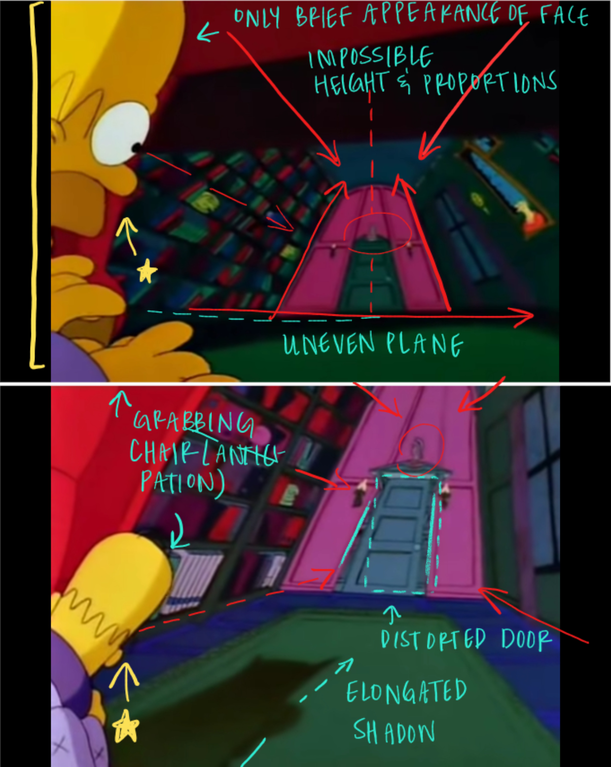 The Simpsons’ “The Raven” demonstrates Expressionist influence to convey the outward manifestation of paranoia, a material symptom of grief. This adaptation of Poe’s poem uses German Expressionist visual techniques not merely as a stylistic embellishment, but as a deliberate narrative strategy. By distorting the physical environment, the animation externalizes Homer’s psychological state, allowing viewers to experience his deteriorating mental condition as he processes loss. Expressionist aesthetics are a strategic medium to reveal how grief can transform one’s perception of reality, turning a familiar domestic space, a site of comfort and relaxation, into a threatening and uncertain place of inescapable loneliness and isolation.