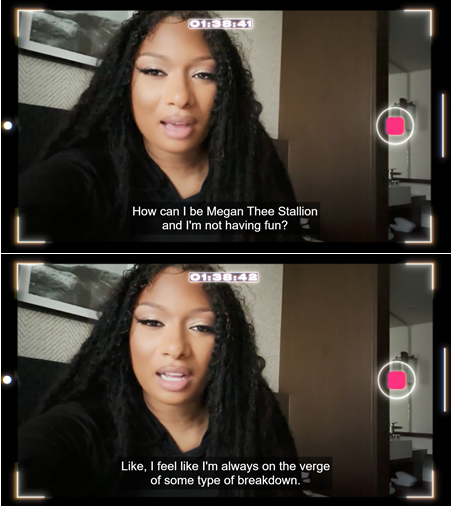 Megan Thee Stallion glances away from the camera as she continues her concession. As she looks off into the distance, the rapper reveals that she is “always on the verge of some type of breakdown.” In the shot, Megan returns to a direct confrontation with the camera when she says breakdown. Her gaze is both indiscernible and withdrawn; the viewer might recognize a forlorn essence registering on Megan’s face, but fail to perceive the rapper’s conscious mediation of her testimony.